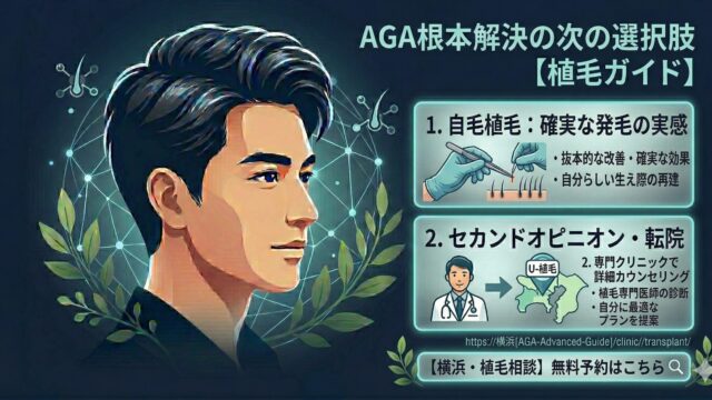 AGA治療・薬 AGA治療で効果が出なかった場合の次の選択肢 AGA治療薬を続けても効果が感じられない方へ。治療が効きにい原因と、自毛植毛・メソセラピーなど次のステップとなる選択肢をわかりやすく解説します。 2026.03.01 AGA治療・薬