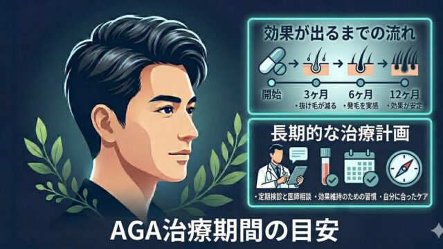 AGA治療・薬 AGA治療期間の目安 AGA治療で効果を実感するまでの期間は一般的に3〜6ヶ月。治 療薬別の効果が出るタイムラインと、長期で続けるコツをわかりやすく解説します。 2026.03.01 AGA治療・薬