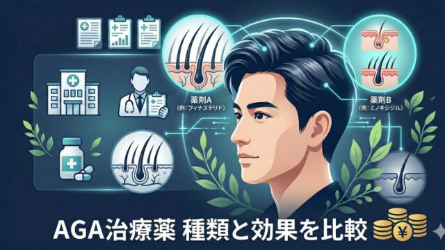 AGA治療・薬 AGA治療薬の種類と効果を比較 AGAで使われる主要3種類の薬(フィナステリド・デュタステリド・ミノキシジル)の仕組みと効果の違いをわかりやすく比較。自分に合う薬の選び方も解説。 2026.03.01 AGA治療・薬
